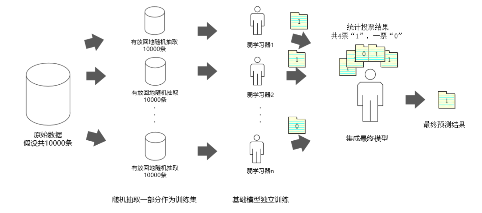 Bootstrap 抽样:从原始训练数据集中随机抽取若干个样本(有放回抽样),形成多个不同的子集,每个子集用于训练一棵决策树。