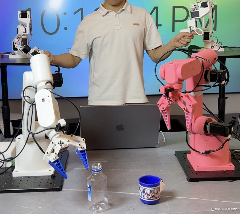 使用关节空间映射进行遥操作(操作员通过反驱动较小的"领导"机器人来控制较大的"跟随"机器人)