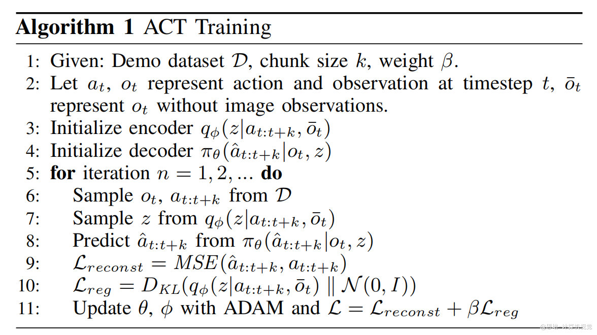 ACT原理介绍一、ACT 简介:下面的原理介绍,基于 ACT 论文,知识点较多,如果有谬误,欢迎反馈。论文地址:https://arxiv.org/pdf/2304.13705项目官网:https://tonyzhaozh.github.io/aloha/我们使用的代码库:https://github.com/huggingface/lerobot时间版本改动点2025-09-09V 1.0第一次成稿这篇论文主要介绍了一个用于精细双臂操作的低成本学习系统,包含两个核心组件:1.1.1 ALOHA 硬件系统低成本双臂遥操作平台:整套系统成本不到 2 万美元,使用现成机器人和 3D 打印组件构建设计原则:低成本、多功能、用户友好、易维修、易组装技术特点:使用关节空间映射进行遥操作(操作员通过反驱动较小的"领导"机器人来控制较大的"跟随"机器人)配备 4