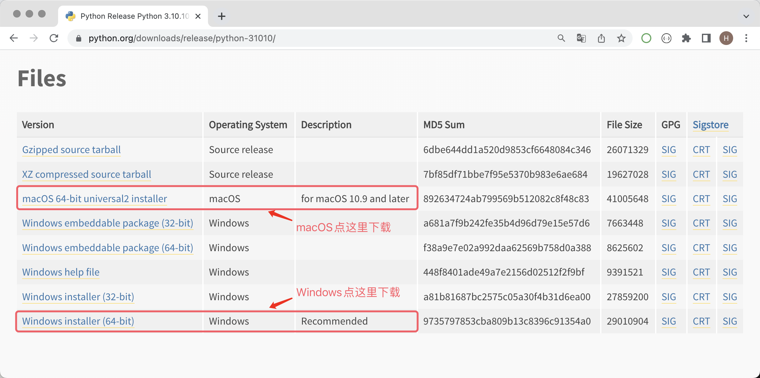进入下载页面后,有些 Python 版本并没有提供 Windows 和 macOS 系统的安装程序,只提供了源代码的压缩文件,对于熟悉 Linux 系统的小伙伴,我们可以通过源代码构建安装;对于使用 Windows 或 macOS 系统的小伙伴,我们还是强烈建议使用安装程序。例如,你想安装 Python 3.10,选择 Python 3.10.10 或 Python 3.10.11 就能找到 Windows 或 macOS 系统的安装包,而其他版本可能只有源代码,如下图所示。
